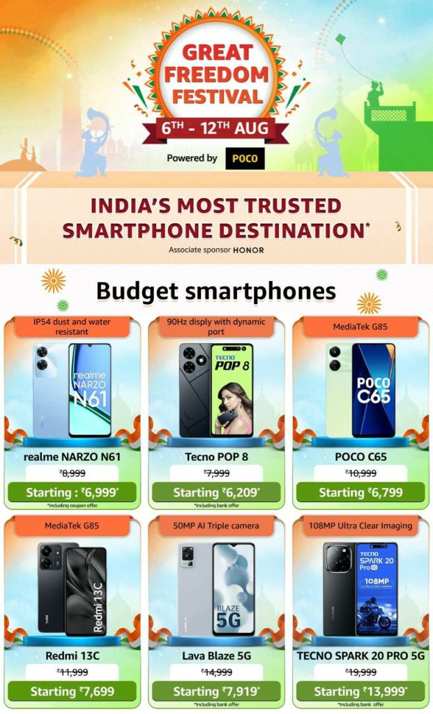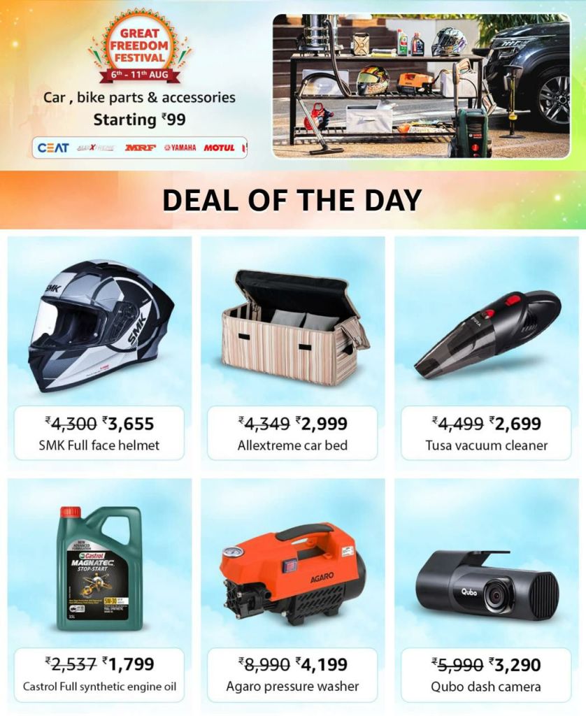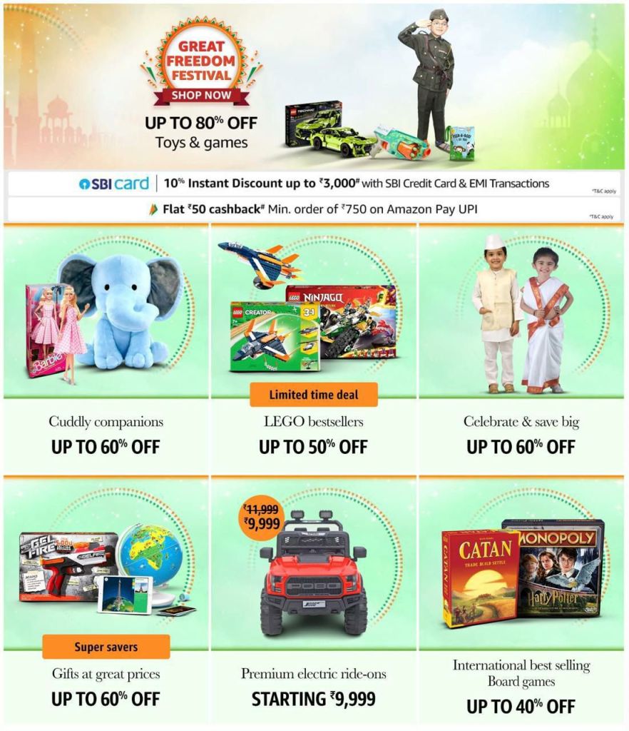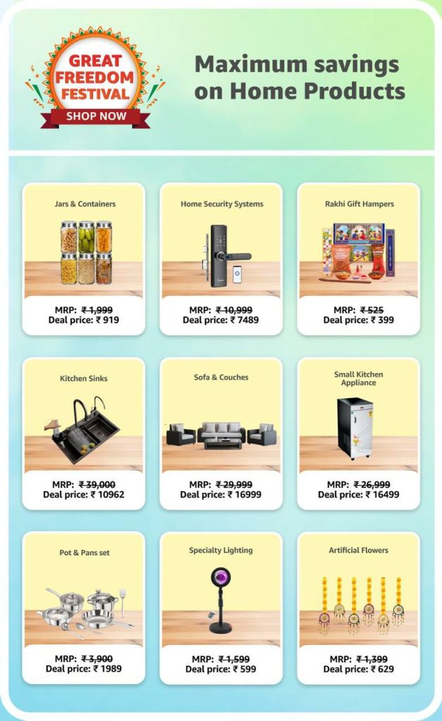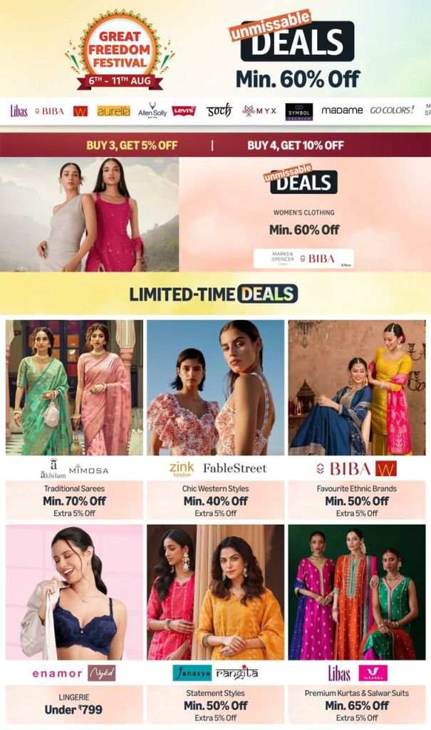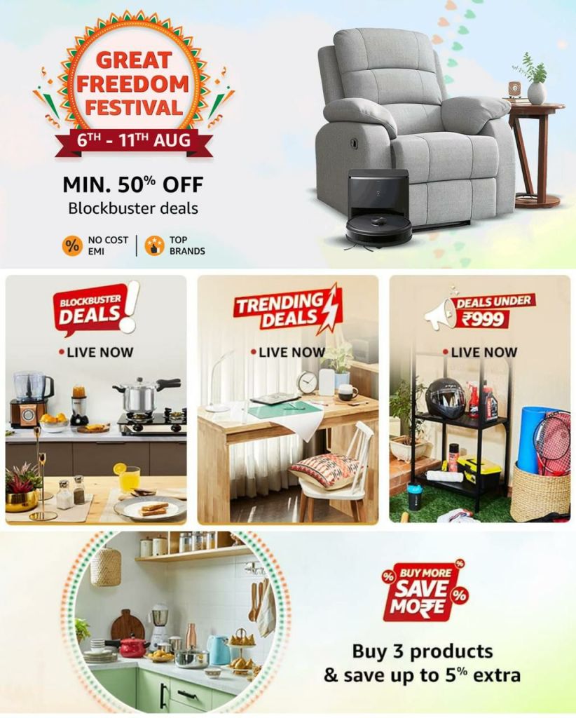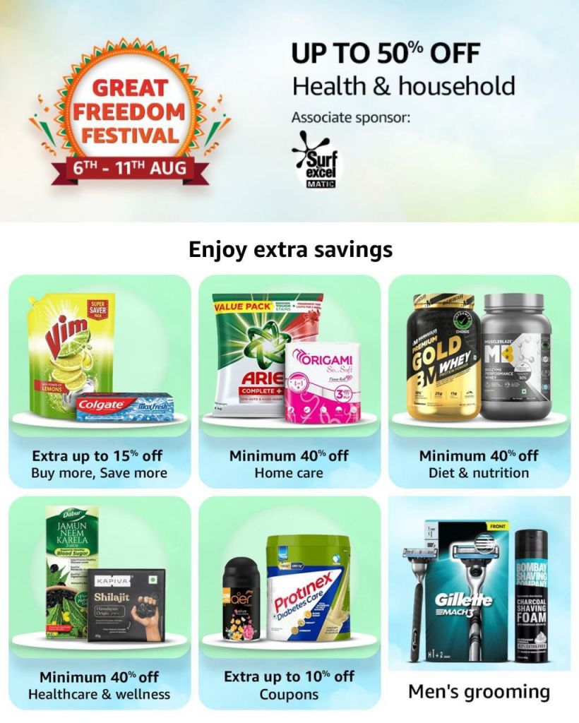 Keywords: Amazon deals, discount electronics, fashion sale, home appliances discount, best smartphones, beauty products sale, kitchen appliances offer, Amazon sale, great freedom festival, Amazon India, top offers, online shopping, discount offers, special deals, cashback offers, trending products, Alexa, Fire TV, smart home, men’s grooming, beauty combos, health & wellness, travel bookings, luggage sale, Rakhi gifts, watches on sale, top brands.