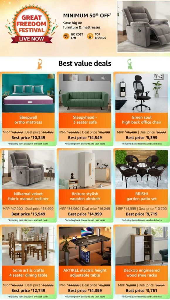 Amazon Brands & More (Up to 70% Off + Extra Cashback): Furniture, Home Products, Kitchen & Dining, Daily Essentials, Automotive Products, Electronic Accessories